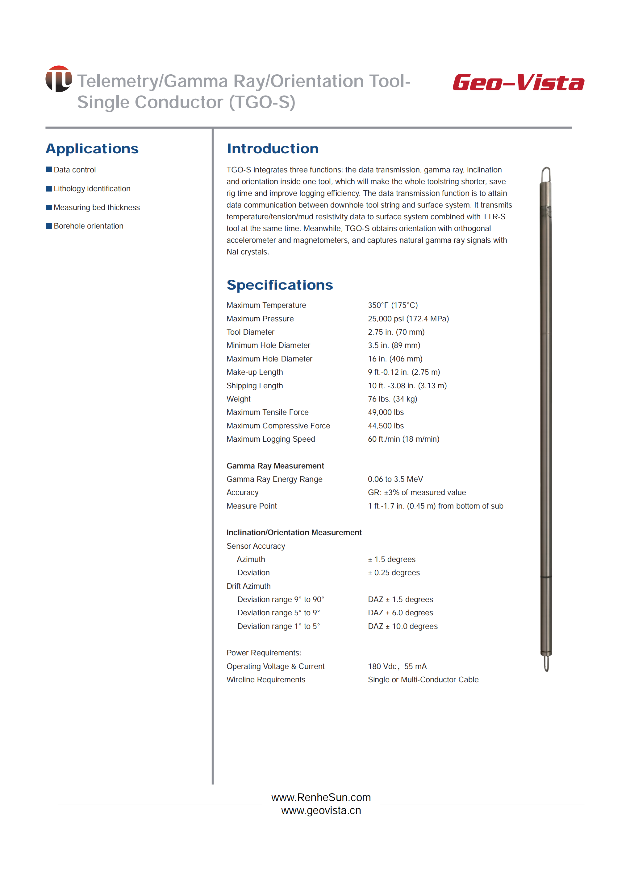 Telemetry/Gamma Ray/Orientation Tool-Single Conductor (TGO-S)